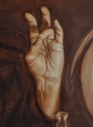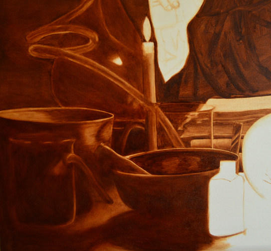 It doesn’t look like much but I’ve done nearly half the work at this point; I’ve honed my idea, taken reference photos, made a custom-sized stretcher, stretched and gessoed the canvas, and done the initial drawing in burnt umber and a medium that I have made from half linseed oil and half mineral spirits. Now I move on to painting in the values in more burnt umber and medium.