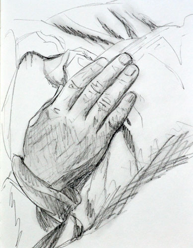 I really ought to do more drawing in my spare time, so I started last night by doing a 15min drawing of Matt’s hand on his leg. It’s not great, but I plan to do this every day, and in a couple months I hope to have some killer drawings of hands!