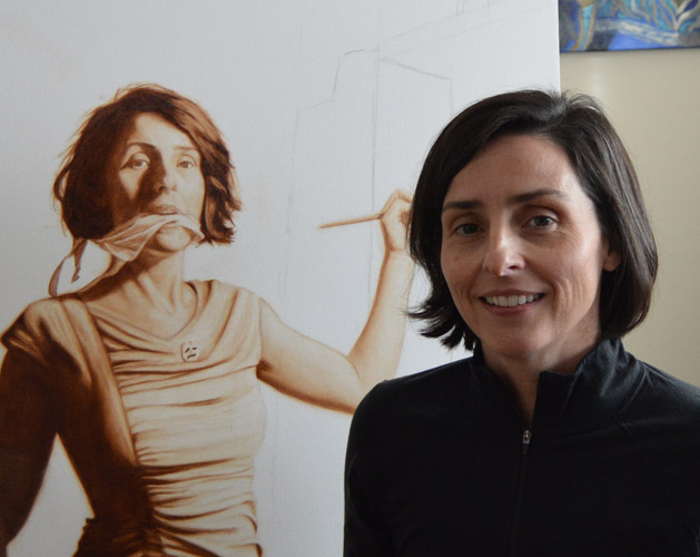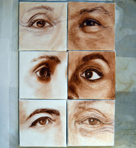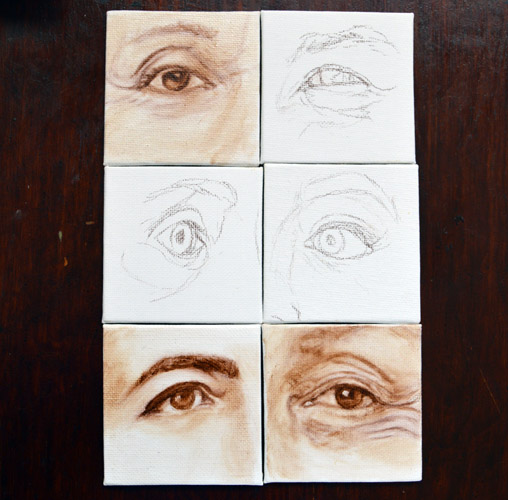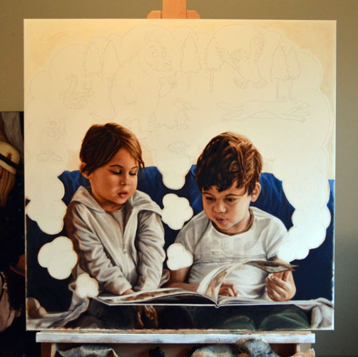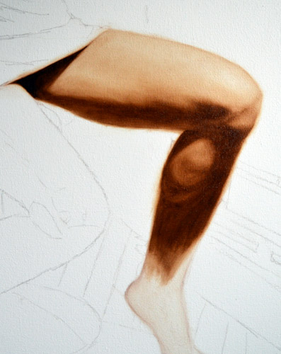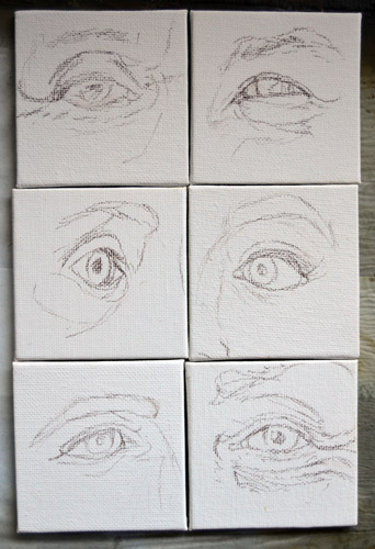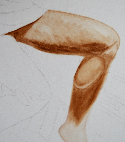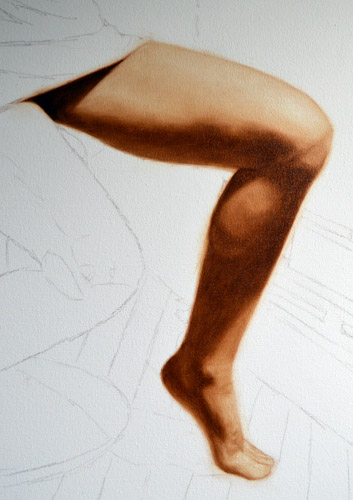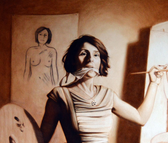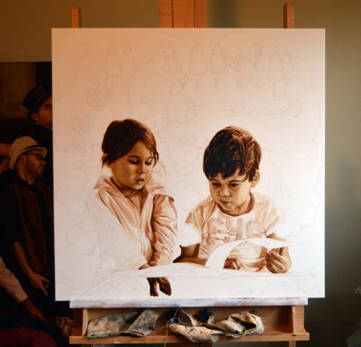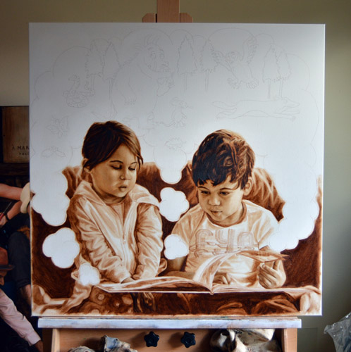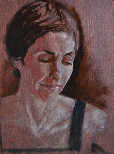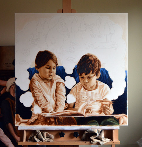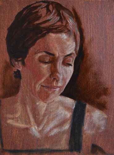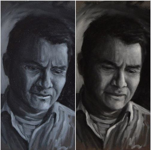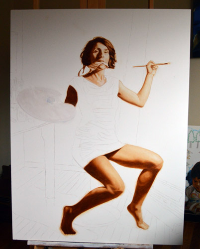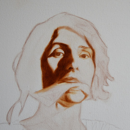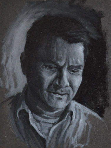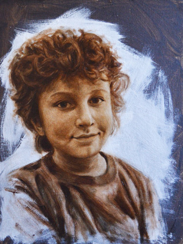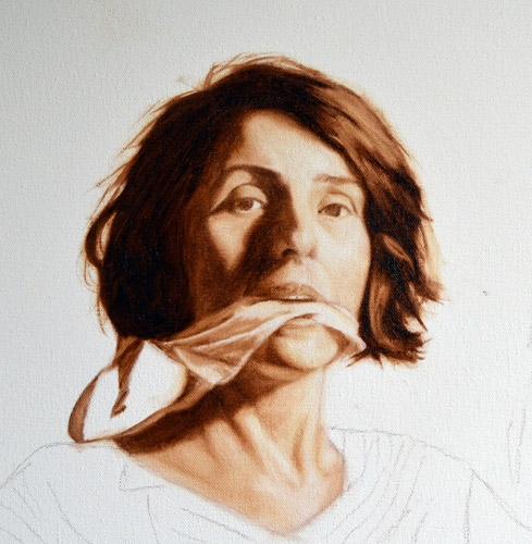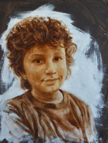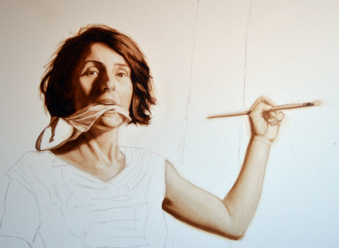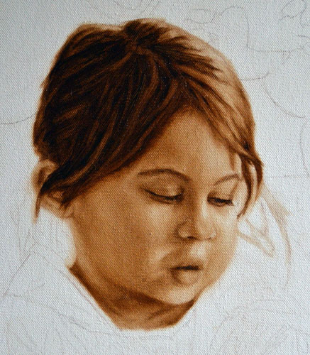 I have done a grisaille today on this commissioned portrait with just black paint – well, it’s not so much a proper grisaille because that would also include white to give more of a grey scale. I find that adding white makes the skin look too grey and I prefer to have more warmth in skin tones, so I make the white of the canvas be my light.