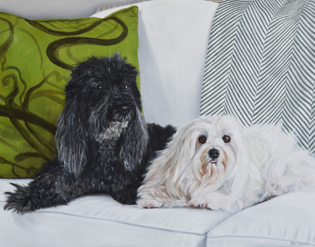 Today I’m very happy with this Maltese I’ve done! I carefully looked at the colours and then made my palette of vermilion red, raw sienna, burnt umber, black, and white. Even though the dog is white, there are lot of colours in those shadows. I applied them all in varying degrees on the dog (second photo), and then took white at the end and dragged it through to get a more accurate colour and to create texture (third photo).