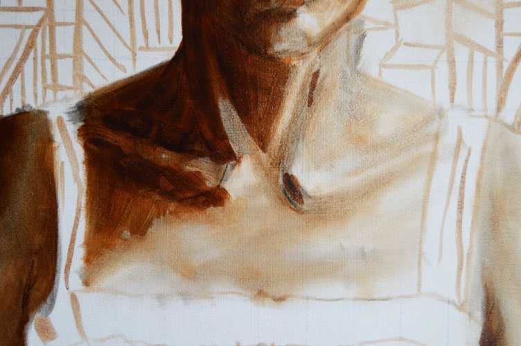 I completed my underpainting using only burnt umber and my light medium mix comprised of 40% linseed oil/60% mineral spirits. This mix dries fast and isn’t gummy. Two more layers of paint go on top of the skin so it’s important that they go on smoothly later. The underpainting will show through in the end; I have to get it right! I have purposely done this underpainting rather rough, or structural, with visible brushstrokes to imitate my architectural forms all around her.