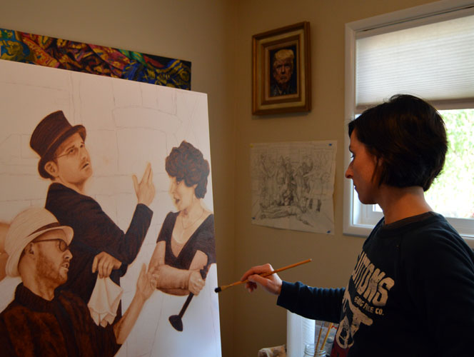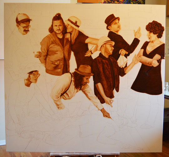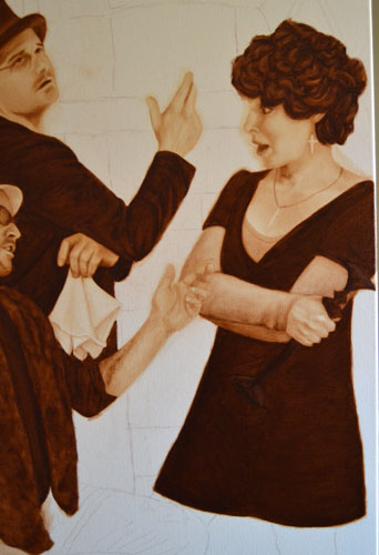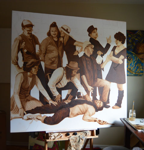 I had to figure out how to paint shag carpeting in an underpainting today and it was actually rather tricky. It took me a long time, with many starts and restarts, and near the end it occurred to me that no Old Master had to figure out how to paint shag carpeting! I was feeling pretty damn good about it, until I remembered that they figured out to paint skin. I think I’ll stop patting myself on the back now.