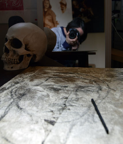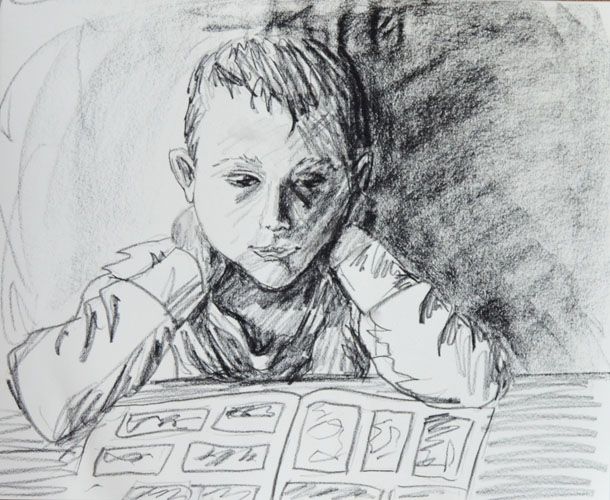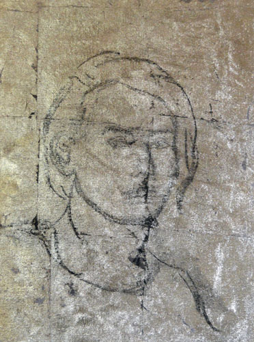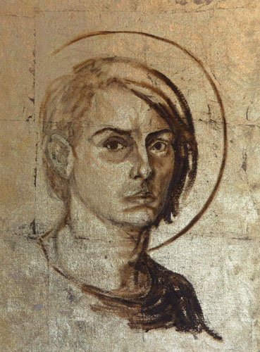 So, I’m thinking about imprimatura today, which is the practice of laying a neutral ground (usually a burnt umber or some other warm mid-tone) on which you go straight to a grisaille to build the forms with contrasting light and dark on top. It occurs to me that I’ve never seen anyone do this on gold. Can I not make gold my neutral ground?! Has this ever been done? Does it fail miserably? I have decided to do a self-portrait sketch first using a mirror (because no other model is so close at hand) and I have discovered that only Bic pen and charcoal stick will stick to gold. Charcoal erases quite easily so, I’ve gone with that. I’d sketch directly with paint but I haven’t got enough time to devote to this today. I’m also building an automatic underground irrigation system for my new vegetable garden, so… priorities.