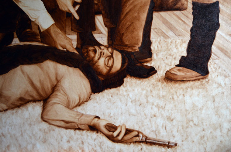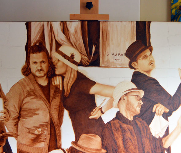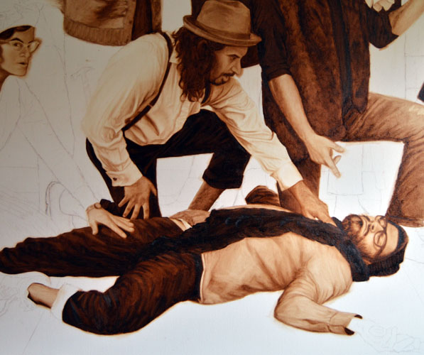 I’ve been thinking for a long time that the mirror over the mantel should be more than just a mirror reflecting the ceiling and it finally hits me this morning that it should be another murder scene painting, specifically ‘The Death of Marat’ by David. Since my memory of the French revolutionary figure is a little spotty, I look him up and find that he was the champion of the ‘sans-culottes’ movement, who were literally those ‘without culottes,’ or those silk shorts that the bourgeoisie wore. The sans-culottes used fashion as a revolutionary political statement and Marat was the original hipster. I’ve roughed in the bottom portion of the painting over the mantel, deliberately keeping it rough so that it looks more painterly.