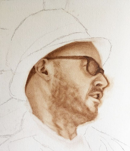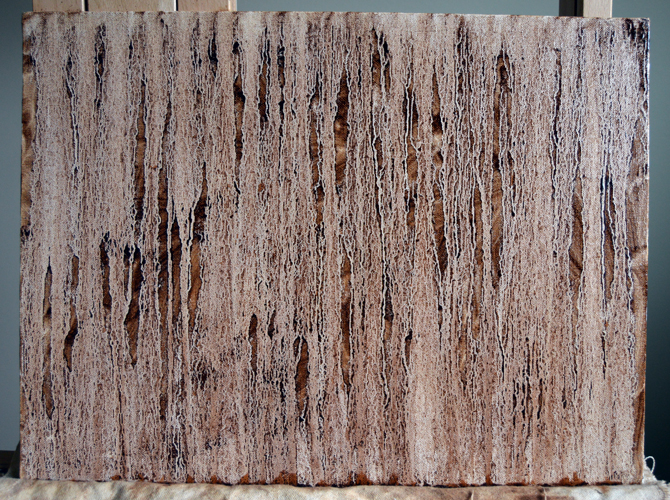 I’m starting a commission of a beautiful little dachshund, and so, I have prepped the canvas by putting on a wash first. For this I painted burnt umber with just mineral spirits on the entire board and then dabbed more mineral spirits across the top so that it ran down and created a textured surface. I’ll start the drawing portion when this is dry…