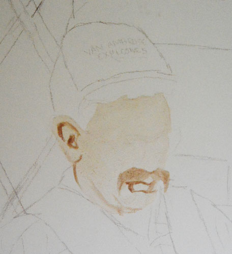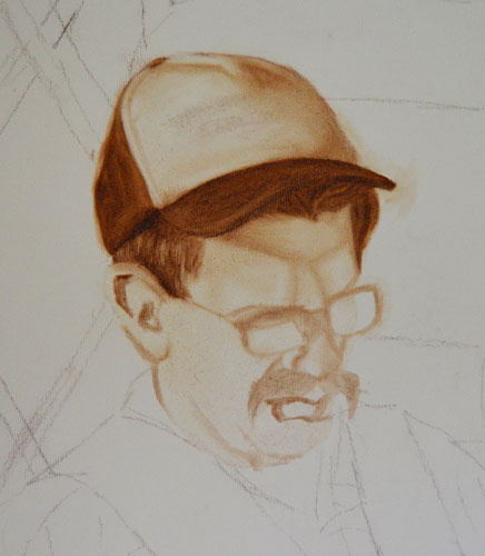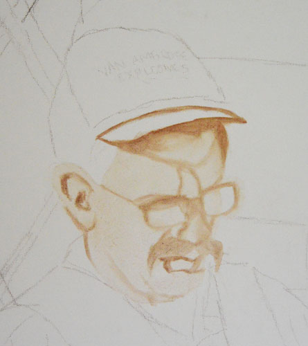 When starting a new underpainting I look to render the facial features accurately and also, the tonal values. Establishing the correct lighting is a crucial yet tricky job. After having a moment to look at what I’ve done today, I have decided that this head will require another layer to darken up the shadows on the skin. I’ll start tomorrow’s painting session on this head once again, after it has dried.
