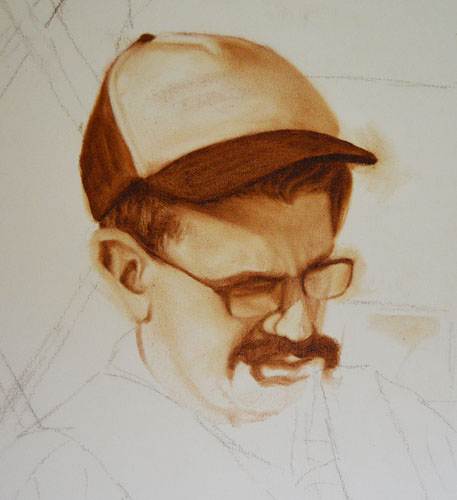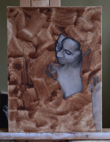 I’ve simply taken a canvas board and painted a wash of burnt umber with mineral spirits quite thickly, then took my brush (dripping in mineral spirits) lengthwise across the canvas to create all kinds of ruts, drips, and texture. Instead of doing an underpainting in burnt umber and then grisaille, I can go straight to grisaille from here.