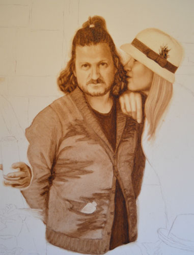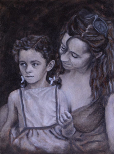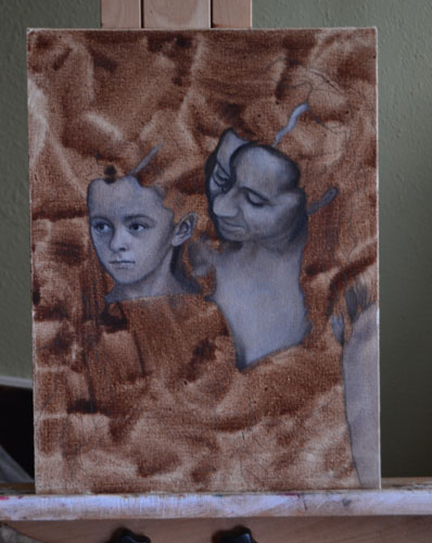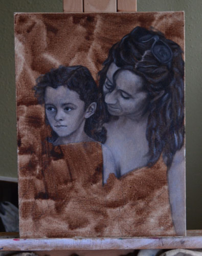WIP: This is a painting of my dear friend Laura and her daughter. Laura is such a caring mum and a beautiful person, so I hope that that shows through. I’ve done a really rough burnt umber wash, drawn the figures in pencil, and now I’m going straight to grisaille.