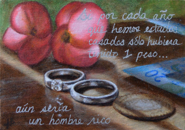 I finished up this little commission this week. I found oil-based pens at the shop and, as per the client’s request, I have written over top “Si por cada año que hemos estados casados sólo hubiera tenido 1 peso… aún sería un hombre rico” which translates to “If for every year that we’ve been married I only had one peso… I would still be a rich man.” They’ll be married 30 years soon and so there are 30 pesos in the painting, along with their wedding rings.