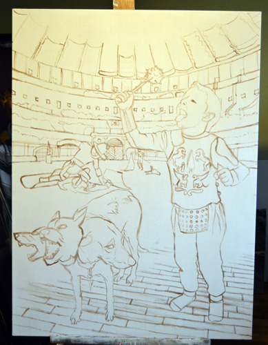 I’m doing another experiment and finished the outline over the weekend. The image is Nico imagining himself as a Roman gladiator in the arena. Any parts that are real (his skin, parts of his clothing, the dog, the floor) will be painted realistically in oil, while the parts he’s imagining (the arena, the extra dog heads, the mace, Nico’s breastplate) will be done roughly in oil pastel to resemble crayon. I’m looking forward to painting this!