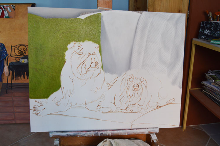 Today I have done the green of the pillow by mixing my green from yellow ochre, cadmium yellow, and viridian green with my heavy medium comprised of 60% linseed oil/40% mineral spirits, so that I achieve a more viscous paint, or glaze (first photo). Then, I took a little bit of black and brushed it into the shadows, and white for the highlights. The black and white help give shape and form to the pillow. When this is dry in a couple of days, I will easily paint on the pattern as the underpainting shows through my glaze and will be my guideline.