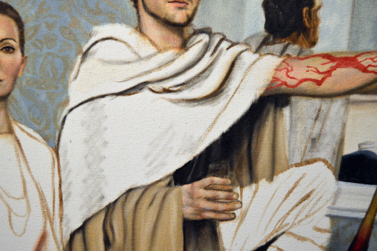 Painting printed fabrics is actually quite tricky and each needs to be approached in a different manner. This one has a white base, so painted it first as if it were a white towel by marking in the shadows with grey/brown (first photo), and then I added a white glaze to even out the colour (second photo). I waited for it to dry and then I carefully marked in the stripes in different coloured glazes (third photo). I used thin glazes so that the dark folds would still come through, giving shadow and volume to the towel. For the stripes reflected in the darker mirror, I added more brown to the same glazes.