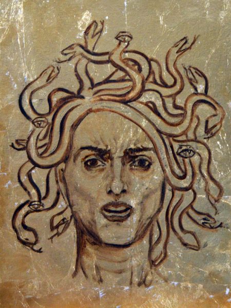 Medusa, 2019, oil and gold leaf on canvas board, 12x16"