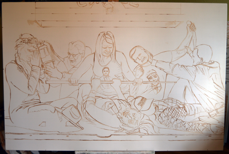 It took three days to put in just the reference lines, but they are finally done and now I continue with the underpainting for ‘The Allegory of Facebook’ in burnt umber and medium.
