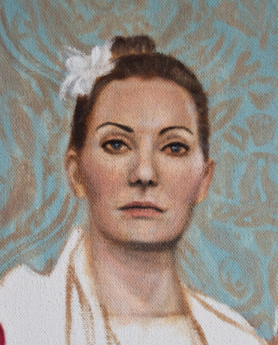 Today I have done the final skin glaze on these two lovelies! I start by making a glaze from yellow ochre, vermilion, and titanium white mixed with a medium made up of 60% linseed oil and 40% mineral spirits. Then I add more red into the cheeks, nose,etc, then white for highlights. I go back in with a very fine brush and do the lines in the eyes, brows, nostrils, and lips again. Steve and Nicole do not look exactly as they do in real life, but it’s pretty close.
