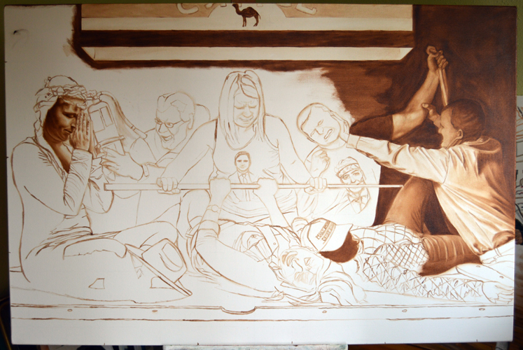 Well, it’s moving along very slowly, but at least it’s moving. I’ve decided to do the entire painting with underpainting, as did Caravaggio, so as to give it more depth and shadow.