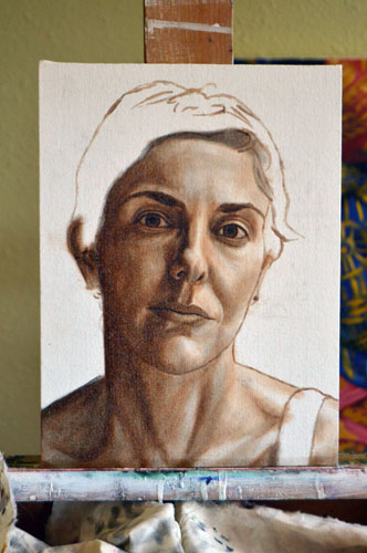 Skin involves three sittings seen in the three photos: the first is burnt umber, the second is grisaille, and the third is a velatura, that is, a thin layer of skin colour comprised of yellow ochre, vermillion, and titanium white with a medium heavy on oil (60% linseed/40% mineral spirits). Then I put extra vermillion into the redder parts of the face, such as the nose, eyelids, lips, etc, and pure white for highlights.